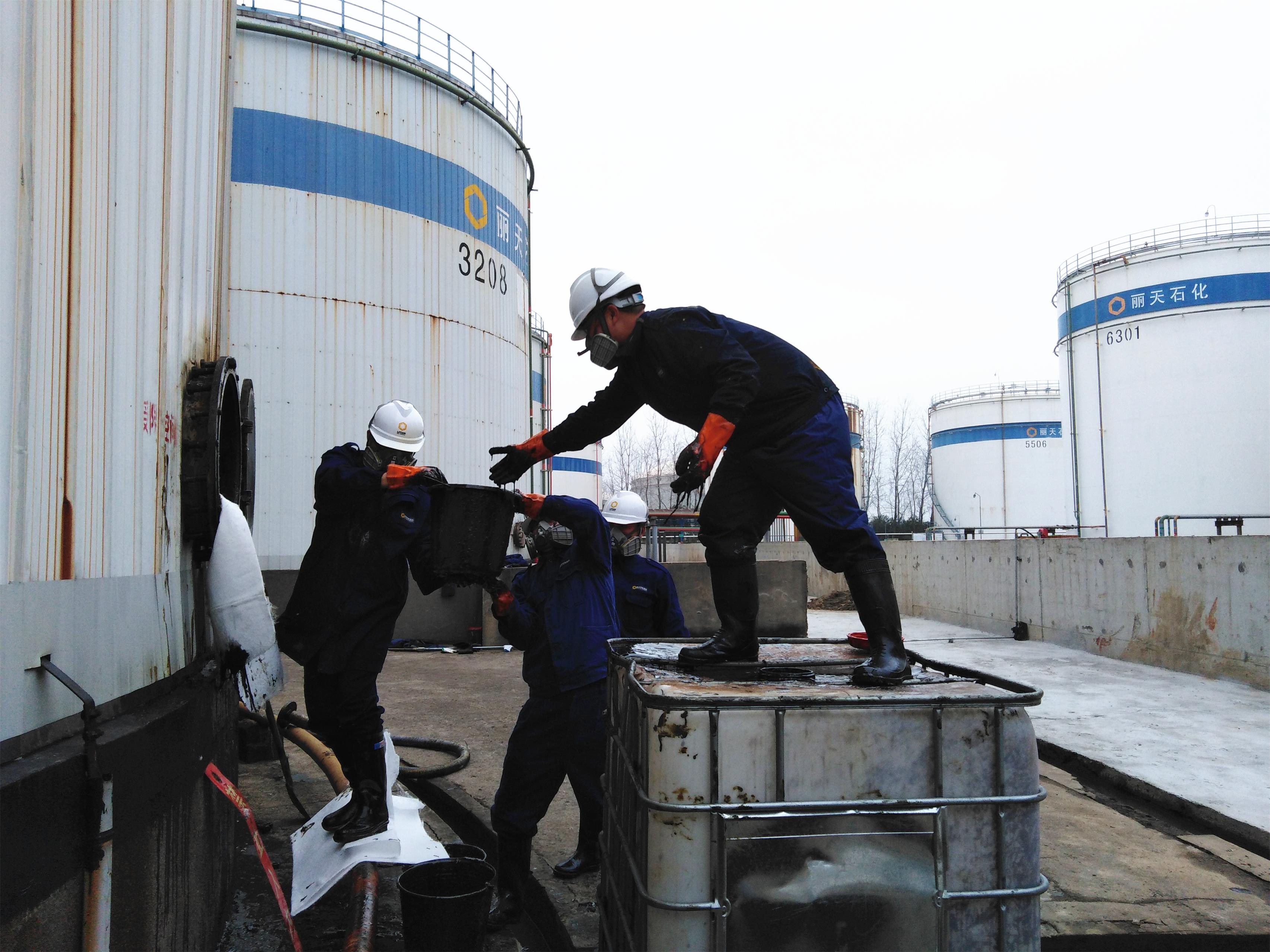 為適應后期業務更換品種,需要對3209罐進行徹底清洗,罐內原存儲品種黏稠度很大,給清洗儲罐帶來了巨大的挑戰,必須使用大量的人工清理。勞動過程中,大家不怕臟不怕累,齊心協力將物料殘渣一桶一桶地運送出來,別看一個立方桶不大,要把它裝滿卻要經過無數次的重復倒灌。雖然天氣寒冷,但是大家干得滿身是汗,雖已經精疲力盡,但稍作休息后又全身心投入到勞動中。